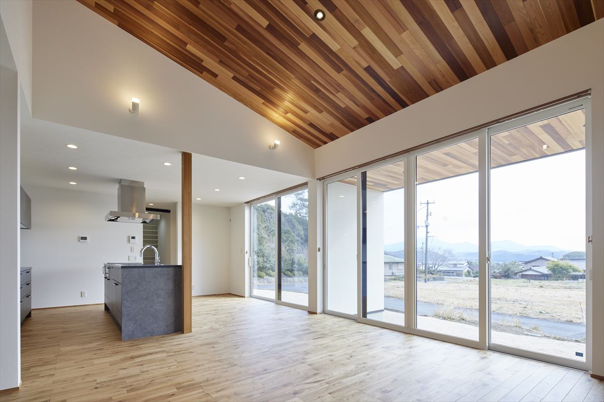吹き抜け天井に木目を取り入れることで、開放的な空間に温もりと上質さが生まれます。