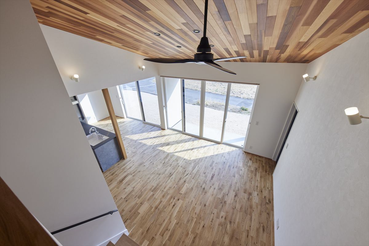 吹き抜け天井に木目を取り入れることで、空間に奥行きと立体感が生まれます。